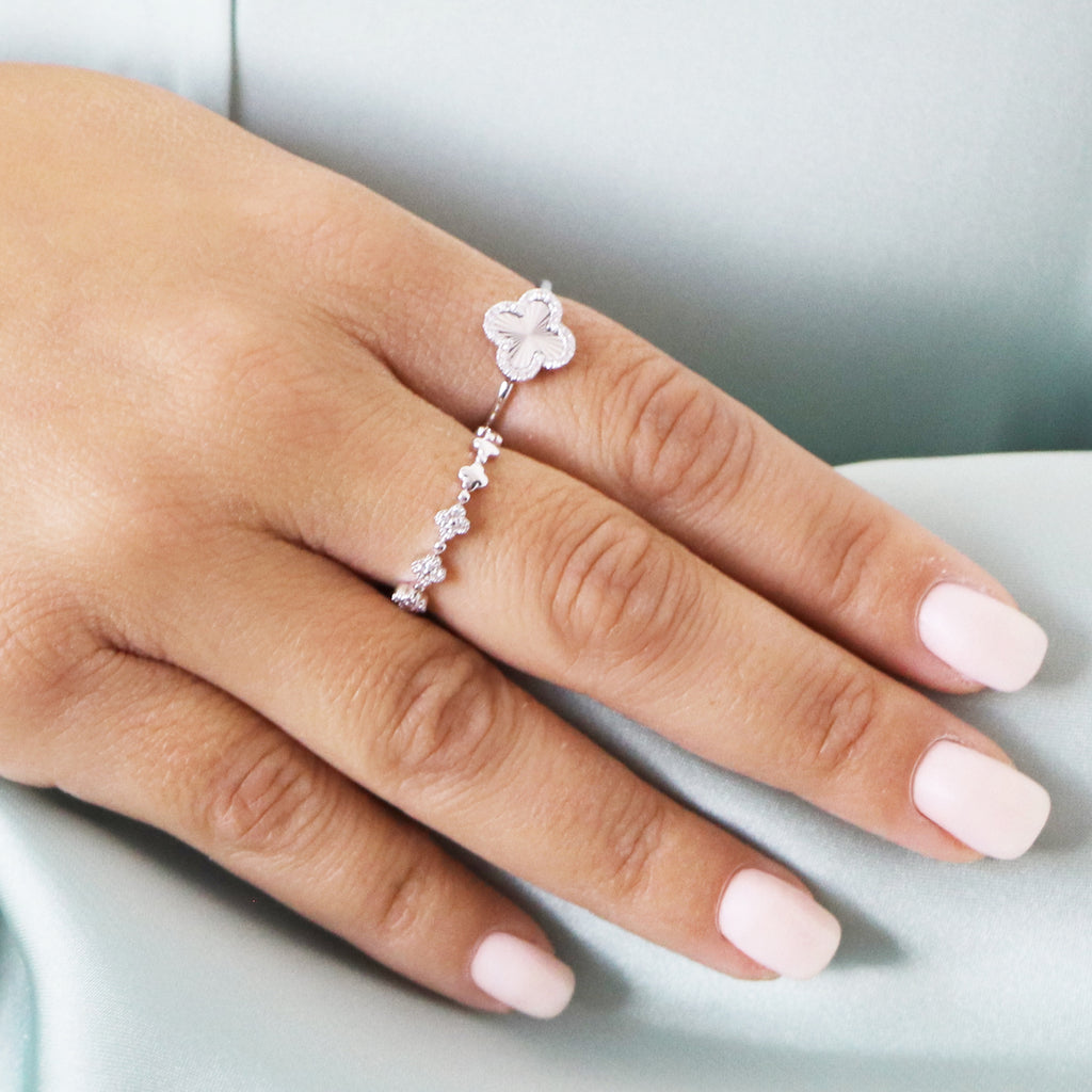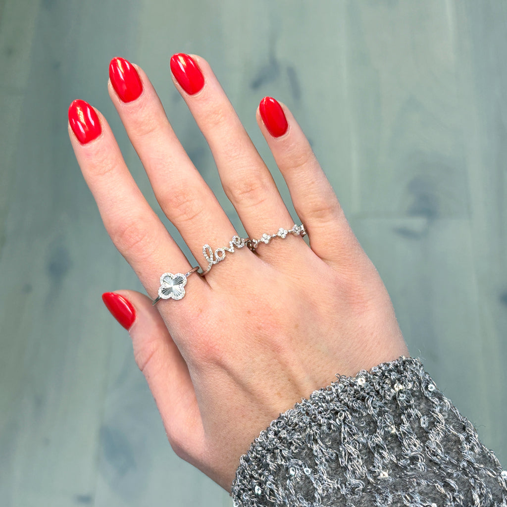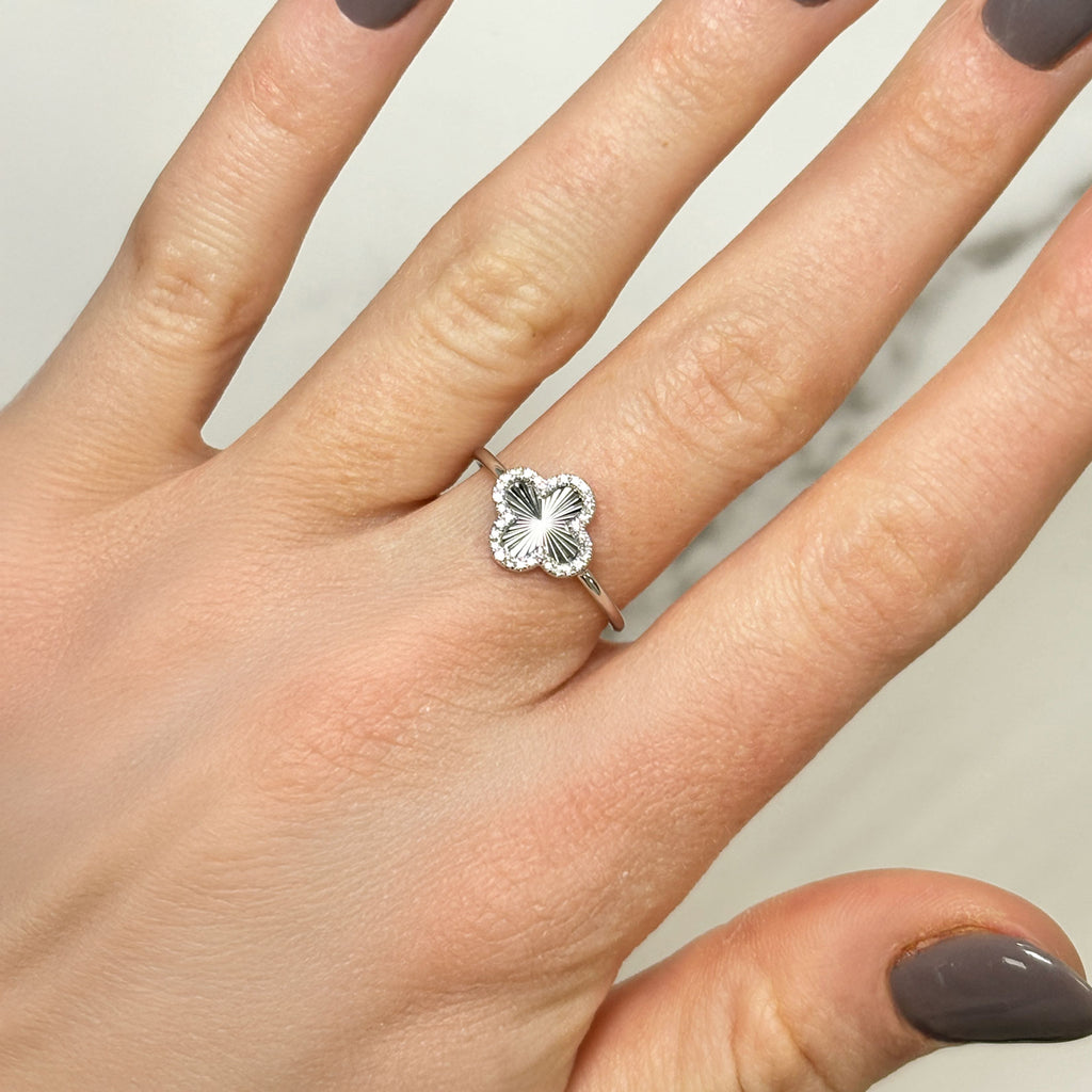 Shine bright with our Fluted Gold Diamond Clover Ring! This elegant piece features a dazzling diamond halo around a charming fluted gold clover design, perfect for adding a touch of luck and sparkle!