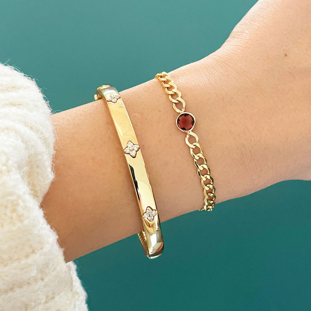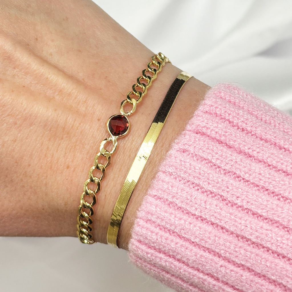 Our garnet curb bracelet adds a fun pop of color to your arm party! Also the perfect birthstone piece for a January baby!