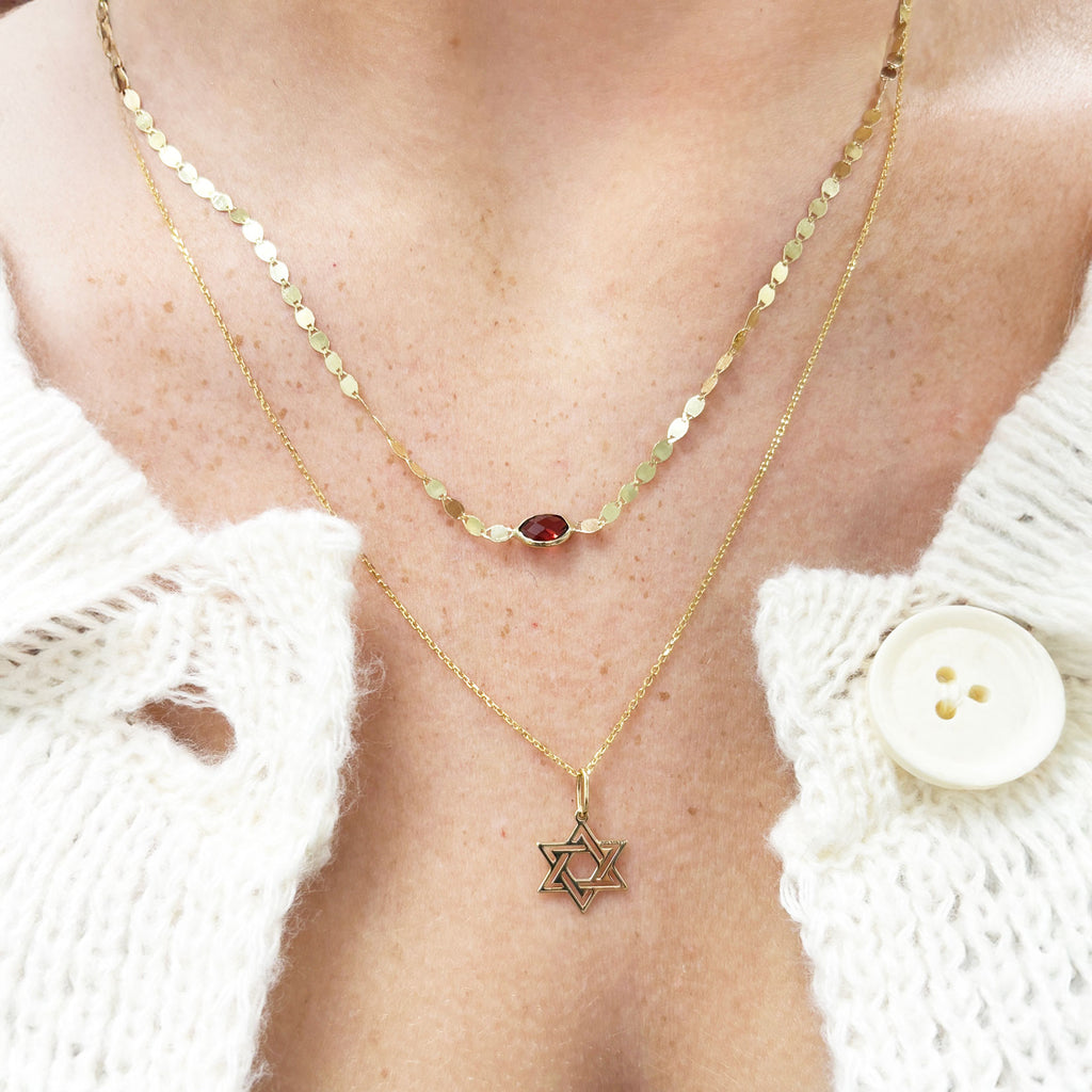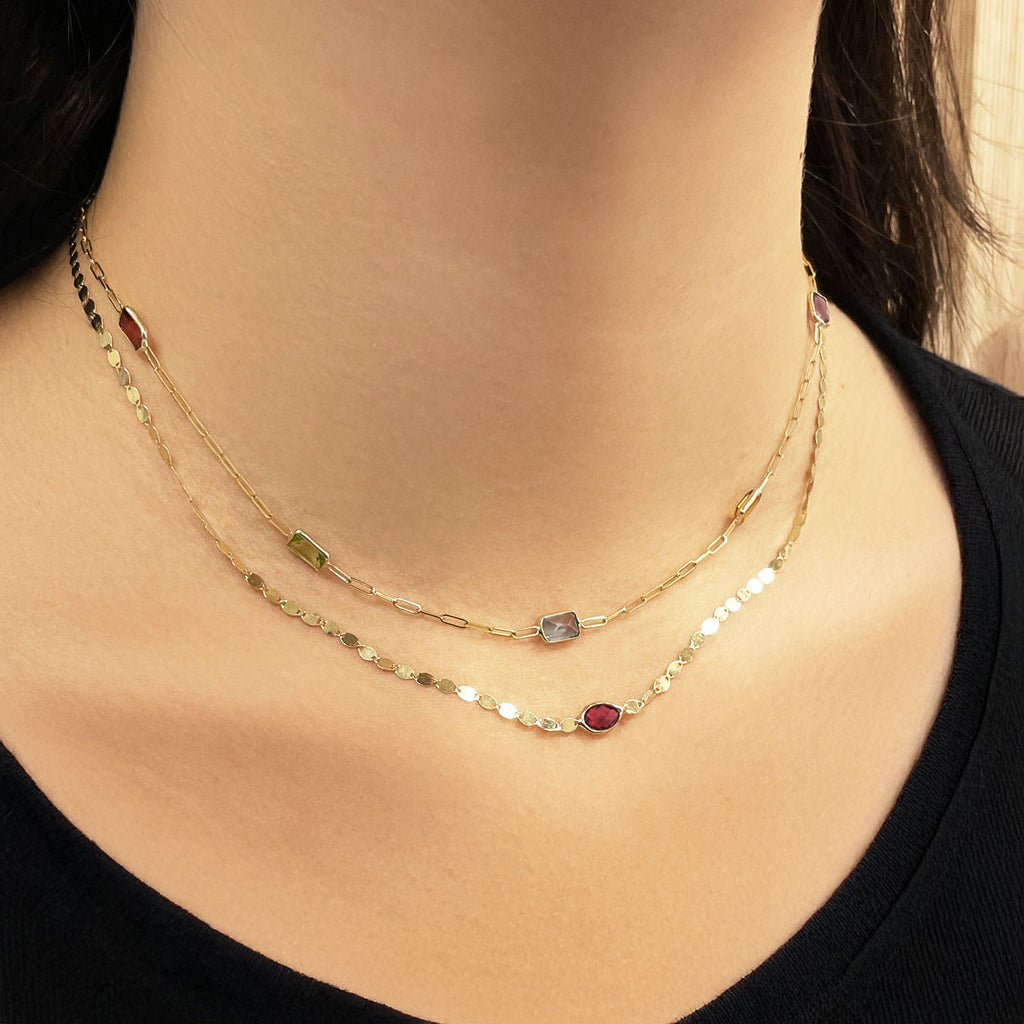 Our garnet disco necklace adds a fun pop of color to your neck look! Also the perfect birthstone piece for a January baby!