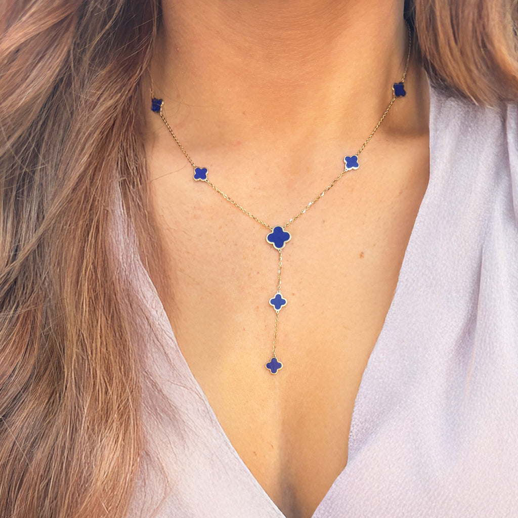 The lariat clover necklace is our go-to piece to add to any look! Available in several gemstone options. Dress it up with a cocktail dress heels, or dress it down with your comfiest loungewear. Either way, you'll be classic chic!